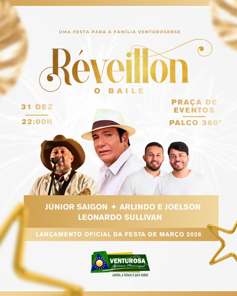 O Governo Municipal de Venturosa convida toda a população para celebrar a chegada de um novo ciclo no Réveillon – O Baile. A festa, pensada exclusivamente para a família venturosense, será realizada no dia 31 de dezembro, a partir das 22h, na Praça de Eventos.