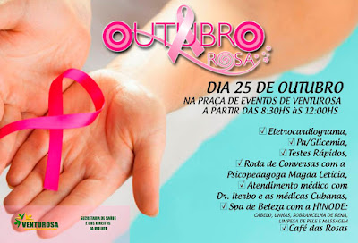 A Prefeitura de Venturosa anuncia como vivenciará o Outubro Rosa em nossa cidade. Serão dois dias com eventos que seguirão a seguinte programação: